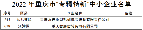 On June 1st, the Chongqing Municipal Commission of Economy and Informatization announced the list of "Specialized, Refined, Special and New" small and medium-sized enterprises in Chongqing for 2022. After being recommended and audited by the competent authorities, evaluated by third-party organizations, and subjected to public scrutiny, both Chongqing Zhizhan Gear Transmission Co., Ltd. and Chongqing Yongjin Heavy Machinery Complete Equipment Co., Ltd. have successfully made it onto the list.
