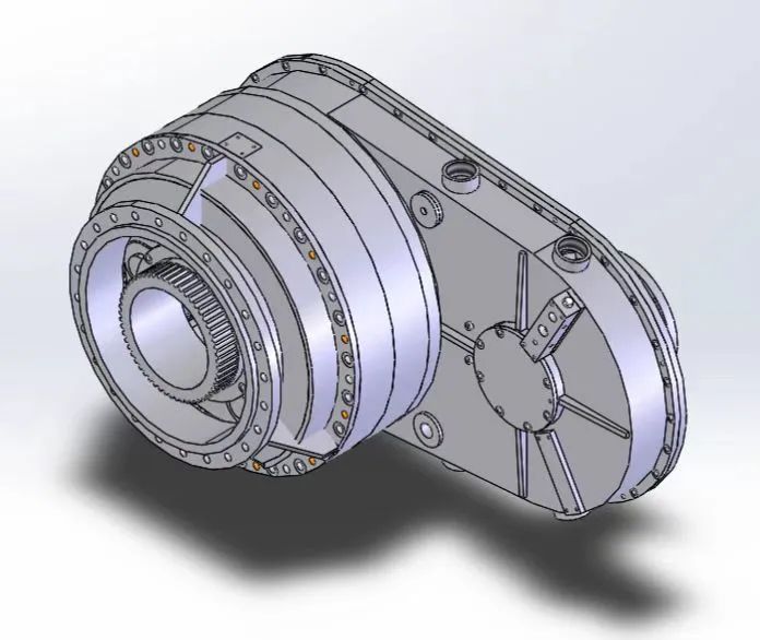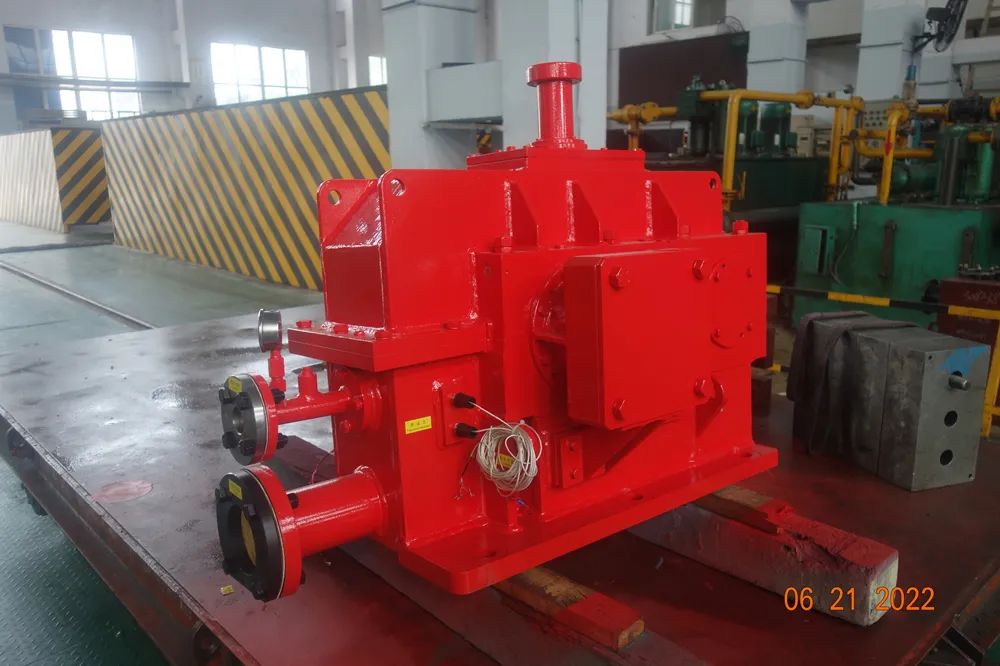 The gearbox is used in a research and development vehicle-mounted fracturing pump for a petroleum unit. It has a total weight of 1.8 tons and an output horsepower of 2088hp. The gearbox is a single-stage parallel shaft plus planetary gear transmission, using a assembled herringbone tooth design, which greatly reduces the installation space and weight. It achieves a high power density transmission with a large center distance in a narrow space, laying an important foundation for our company's entry into the petroleum machinery industry.