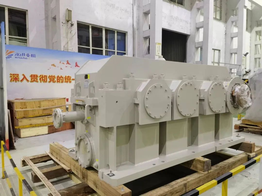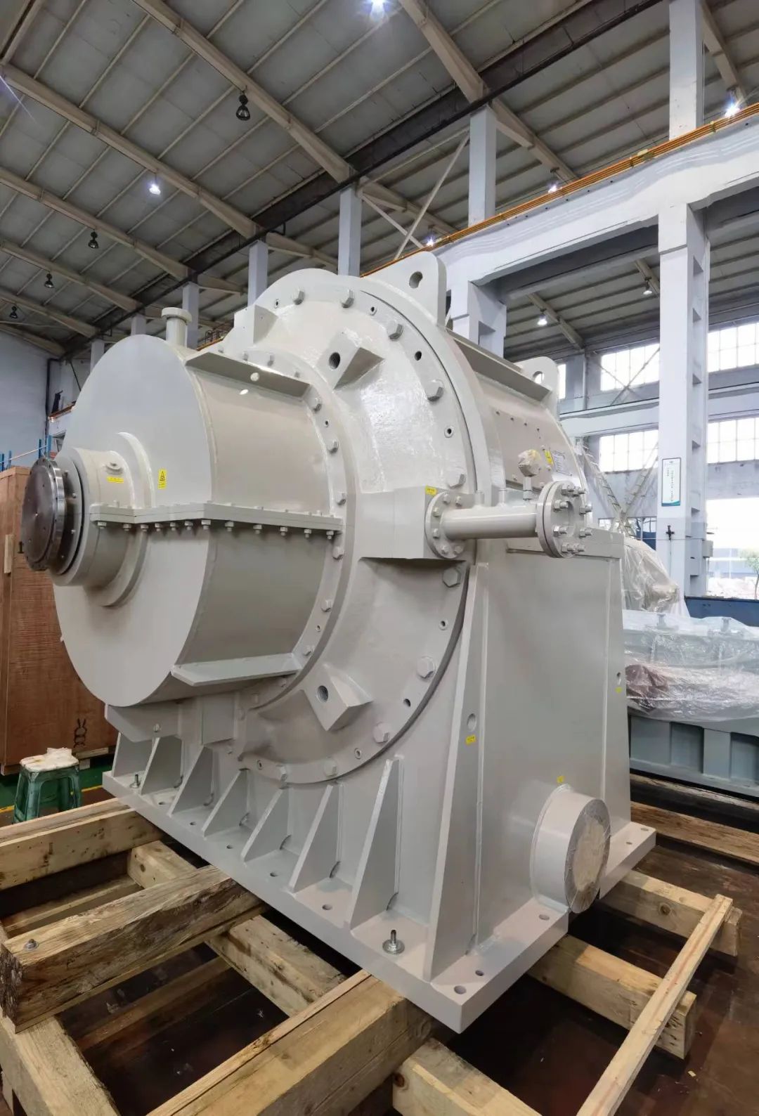 This gearbox is applied in a key equipment of a new carbon dioxide energy storage project verification, where surplus electricity is used during off-peak hours to compress the carbon dioxide gas at room temperature and pressure into liquid form. During peak hours, the stored thermal energy is used to heat the liquid carbon dioxide back to gas state, driving a steam turbine for power generation. This gearbox features a multi-shaft output structure, with an output power of 11MW, a pitch line velocity of 138.5m/s, a large gear diameter of approximately 2m, and high precision machining requirements. It is a precision large-scale thin-walled gear, posing high manufacturing difficulty. Both the design and manufacturing of this gearbox have reached domestic standards, laying a foundation for the localization of multi-shaft gear-type compressors or expanders.